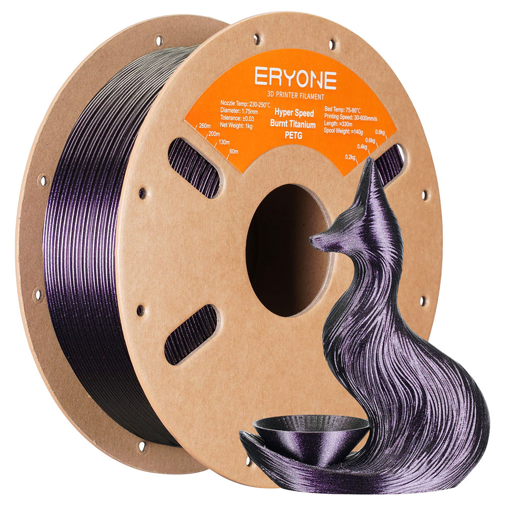 ERYONE High Speed PETG Filament 1kg - Burnt Titanium Rose Red is a premium-grade 3D printing filament engineered for high-speed printing without sacrificing strength or surface quality. This 1.75mm filament combines the toughness of PETG with enhanced thermal stability, allowing for reliable extrusion at speeds up to 600 mm/s. The unique burnt titanium rose red hue offers a striking metallic finish, making it ideal for both functional and display-grade prints. With low shrinkage and excellent dimensional stability, it resists warping and delamination, even during extended prints.