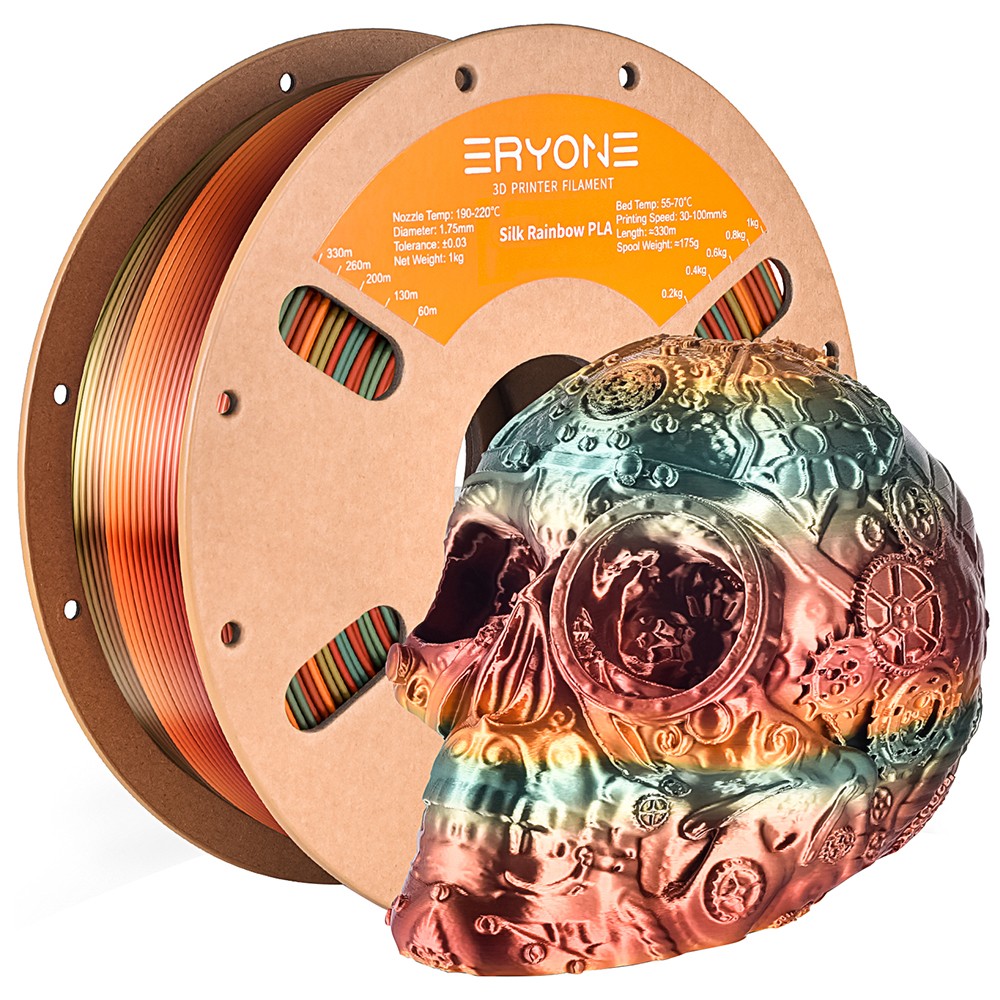 The ERYONE Silk PLA Filament in Steampunk Rainbow is a 1kg spool of decorative PLA designed to give prints a glossy, multi-tone metallic look right off the build plate. Made by Eryone, a filament manufacturer focused on specialty PLA blends, it is intended for desktop FDM 3D printers used to produce display models, props, and ornamental objects.