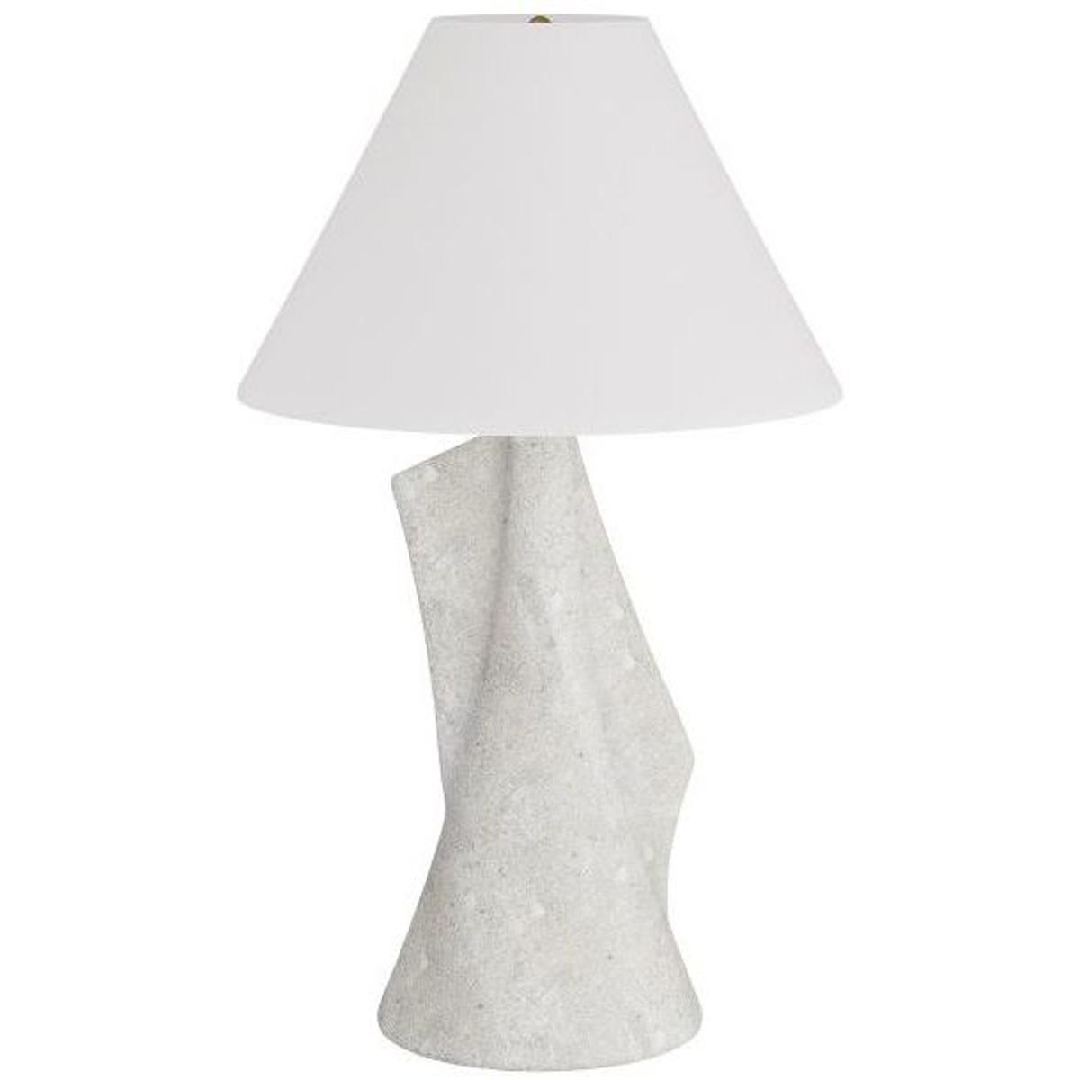 The Arteriors Arteriors PTC22-SH032 Bruce 31.5 inch Table Lamp Portable Light is a modernist sculptural table lamp designed to serve as both functional lighting and decorative art. Manufactured by Arteriors, the lamp features an organic ivory glass stone composite base with flowing fins, an antique brass finial, and an off-white microfiber shade with cotton lining. It measures 31.5 inches tall with a 20-inch diameter shade and includes a 10-foot taupe fabric cord with 2-prong polarized plug.