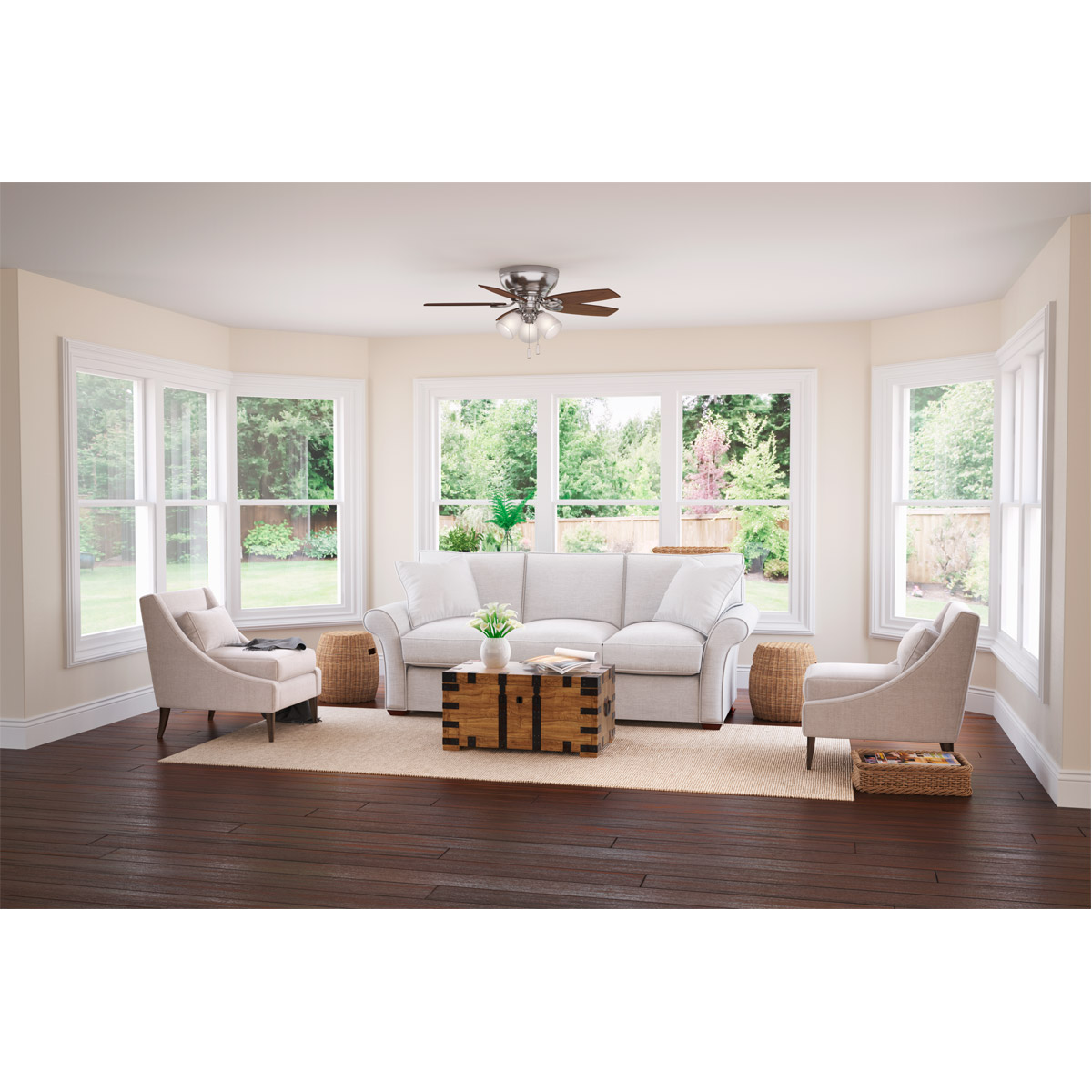 This 3 light Ceiling Fan from the Durant collection by Casablanca will enhance your home with a perfect mix of form and function. The features include a Brushed Nickel finish applied by experts. Product Features Include: Brand: Casablanca, Collection: Durant, SKU: 53187, UPC: 049694531872, Category: Indoor Ceiling Fan, Finish: Brushed Nickel, Glass: Painted Cased White, Width: 44.00 in., Diameter: 44.00 in., Backplate/Canopy Length: 0.00 in., Weight: 18.40 lb., Warranty: Limited Lifetime Motor Warranty, Light Kit Included: Yes, Fan Blade Finish: Walnut, Burnt Walnut, Fan Blade Pitch: 13, Fan Blade Span: 44.0000, Number of Blades: 5, Additional Fan Details: Light Kit Warranty: 1 yearMotor Type: Direct DriveBlades Included: YesSpecific Motor Size: 172x12Speeds: 4Blade Material: PlywoodPull Chain Included: YesReversible Blades: YesCan be used without Lightkits: YesNo-light Cap Included: NoBatteries Included: NoLED Indicator on Transmitter: NoCanopy Type Description: Low Profile (Bar)Dim A - Flush - Ceiling to Bottom of Fan: 8.9Dim B - Flush - Ceiling to Bottom of Fan Blade: 7.75Dim D - Standard - Width of Fan Body: 12.5Dim F - Flush - Ceiling to Bottom of Light: 14.8Dim G - Standard - Height of Motor Housing: 5.98Estimated Yearly Energy Cost: 9.81Reversable Motor: YesLifetime Expectation (hours): 25,000 HrsRPM Information: RPM High: 246, RPM Low: 140, RPM Medium: 188CFM Information: CFM Low: 2110.52, CFM Medium: 2680.41, CFM High: 3210Volts/Hz: 120v/60Hz, Energy Information at High Speed: [Airflow 2,042 Cubic Feet Per Minute, Electricity Use: 61 Watts (excludes lights), Airflow Efficiency: 58 Cubic Feet Per Minute Per Watt], Bulbs Included: Yes, Bulb Category: LED, Primary Bulb(s): 3 x 9.00 watts Medium Base CFL, Color Temperature: 3000K, Color Rendering Index: 80.0000, Total Lumens: 900, Voltage: 120V, Safety Rating: ETL Listed
