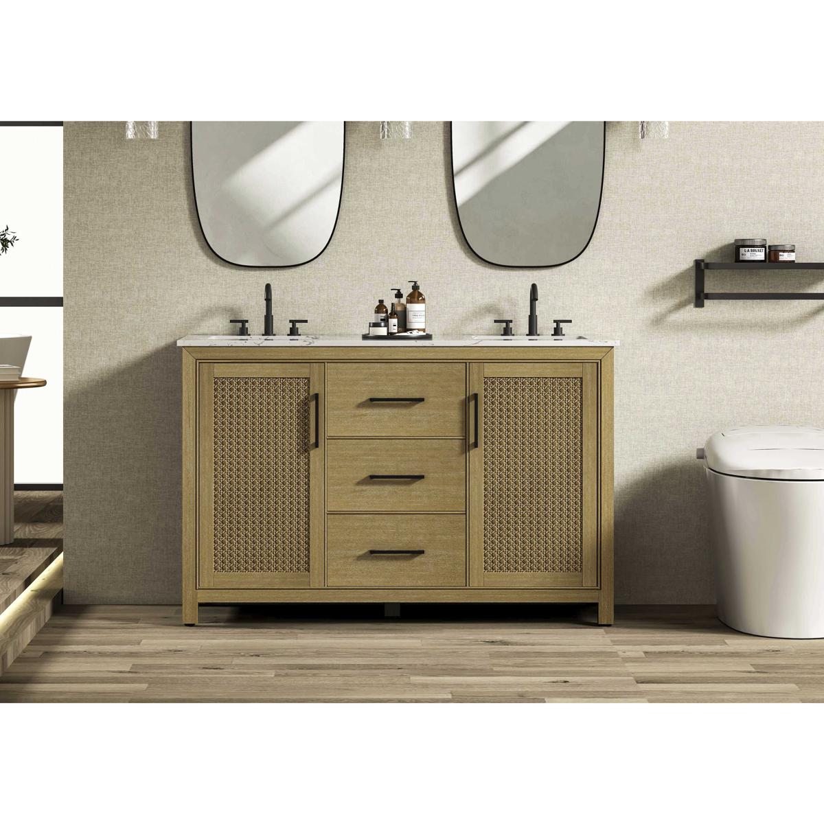 The Elegant Lighting VF29554DLO Alina 54 X 34 inch Linen Oak Bathroom Vanity Cabinet is a transitional-style double vanity manufactured by Elegant Lighting, a Philadelphia-based company operating since 2000. This 54-inch-wide vanity cabinet addresses bathroom storage and countertop space needs while providing visual warmth through natural wood grain patterns and textured caning details on Shaker-style door panels.