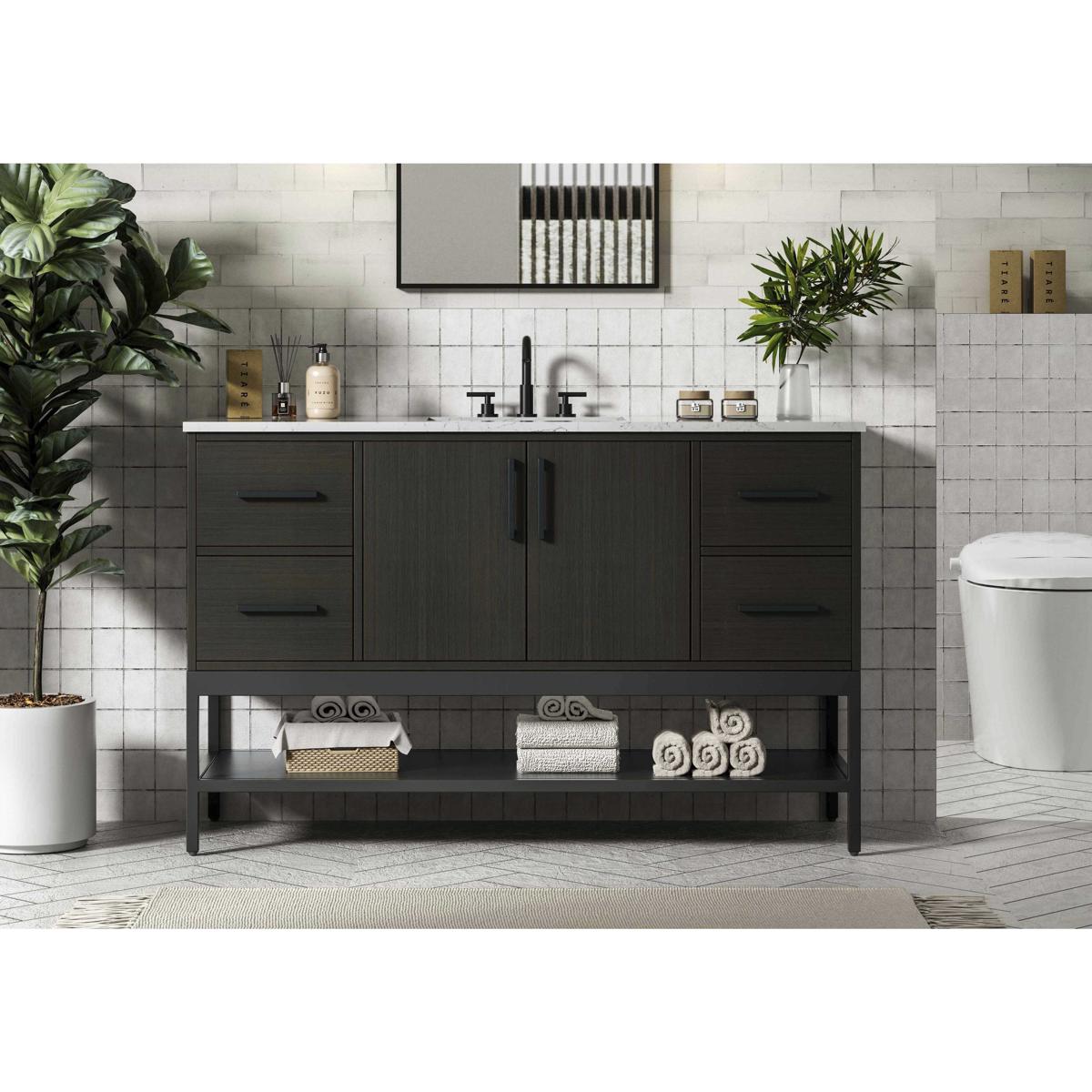 How it compares: Compared to similarly priced 54-inch vanities from Avanity or Design Element, the Lennox VF60754MMB includes an integrated quartz top and undermount sink, whereas competitors often price countertops separately. The solid wood and MDF construction offers better longevity than particleboard models but less durability than all-hardwood alternatives from Kohler or James Martin.