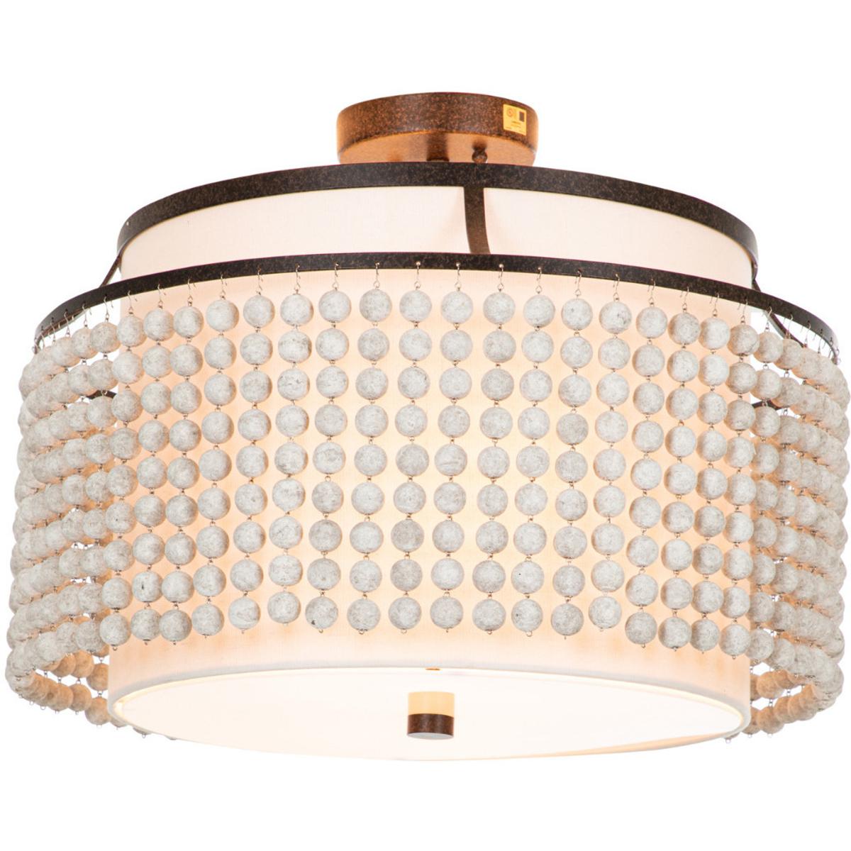 The Gabby Joanna Semi-Flush Mount (SCH-170470) is a decorative ceiling fixture from Gabby's Joanna collection that measures 20.75 inches in diameter and 15.5 inches in height. This two-light semi-flush mount combines multiple materials—Venetian rust-finished iron, cascading distressed ivory wooden beads, feather white linen accent, and a white acrylic diffuser—to deliver soft, ambient illumination with distinctive rustic-elegant styling. Weighing 9.5 pounds, the fixture accommodates two bulbs (not included) and operates via wall switch.