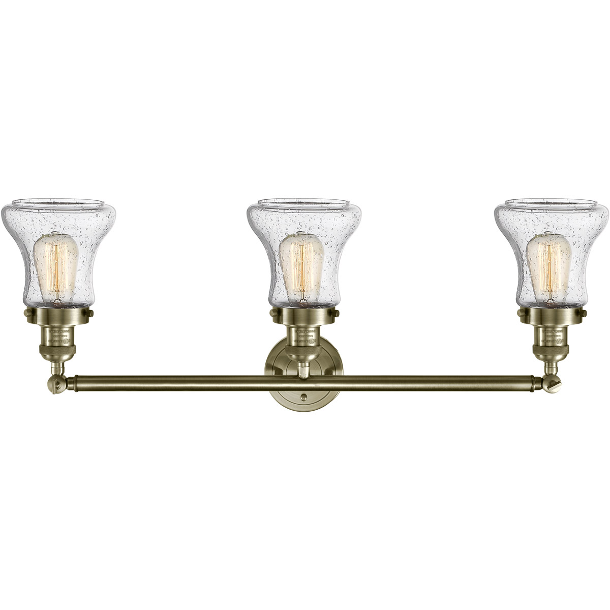 The Innovations Lighting 205-AB-G194-LED Franklin Restoration Bellmont is a 30-inch antique brass bath vanity light priced at $638.00, featuring three integrated 3.5-watt LED bulbs with seedy glass shades. Designed by Bruno Marashlian, it suits homeowners renovating vintage-style bathrooms or installing industrial-farmhouse lighting with UL/ETL damp-location rating and a 2-year finish, lifetime electrical warranty.