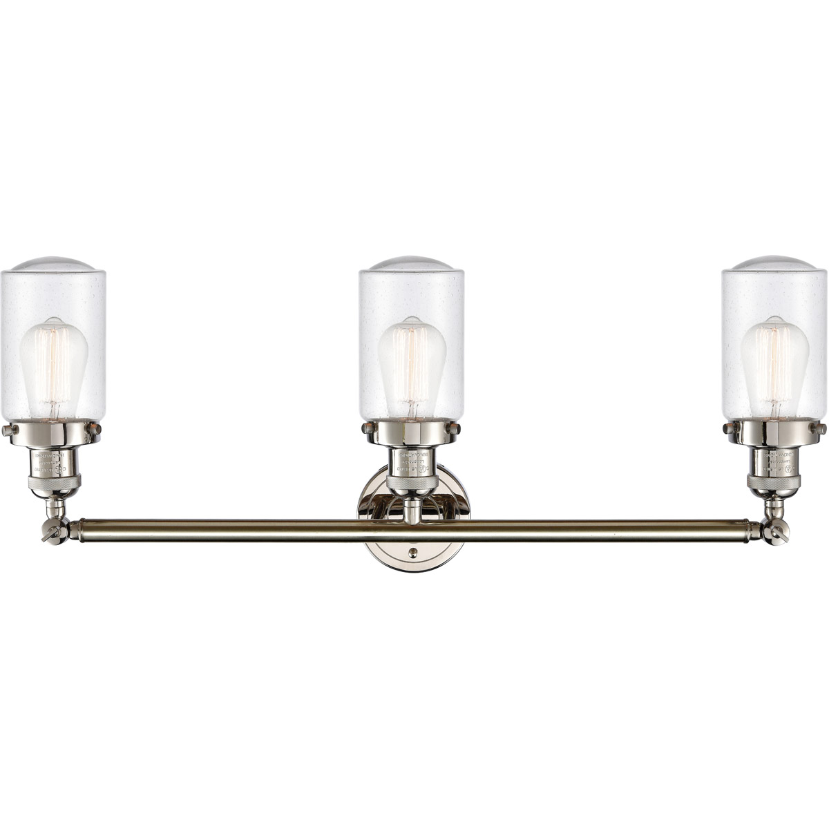The Innovations Lighting 205-PN-G314 Franklin Restoration Dover is a three-light bathroom vanity wall fixture measuring 31 inches wide, manufactured by Innovations Lighting as part of the Franklin Restoration Dover collection. Designed by Bruno Marashlian, this fixture pairs polished nickel finish with seedy Dover glass shades to create a vintage industrial aesthetic. It accommodates three 60-watt medium-base ST64 vintage bulbs (sold separately) and carries UL/ETL damp location safety ratings for bathroom installation.