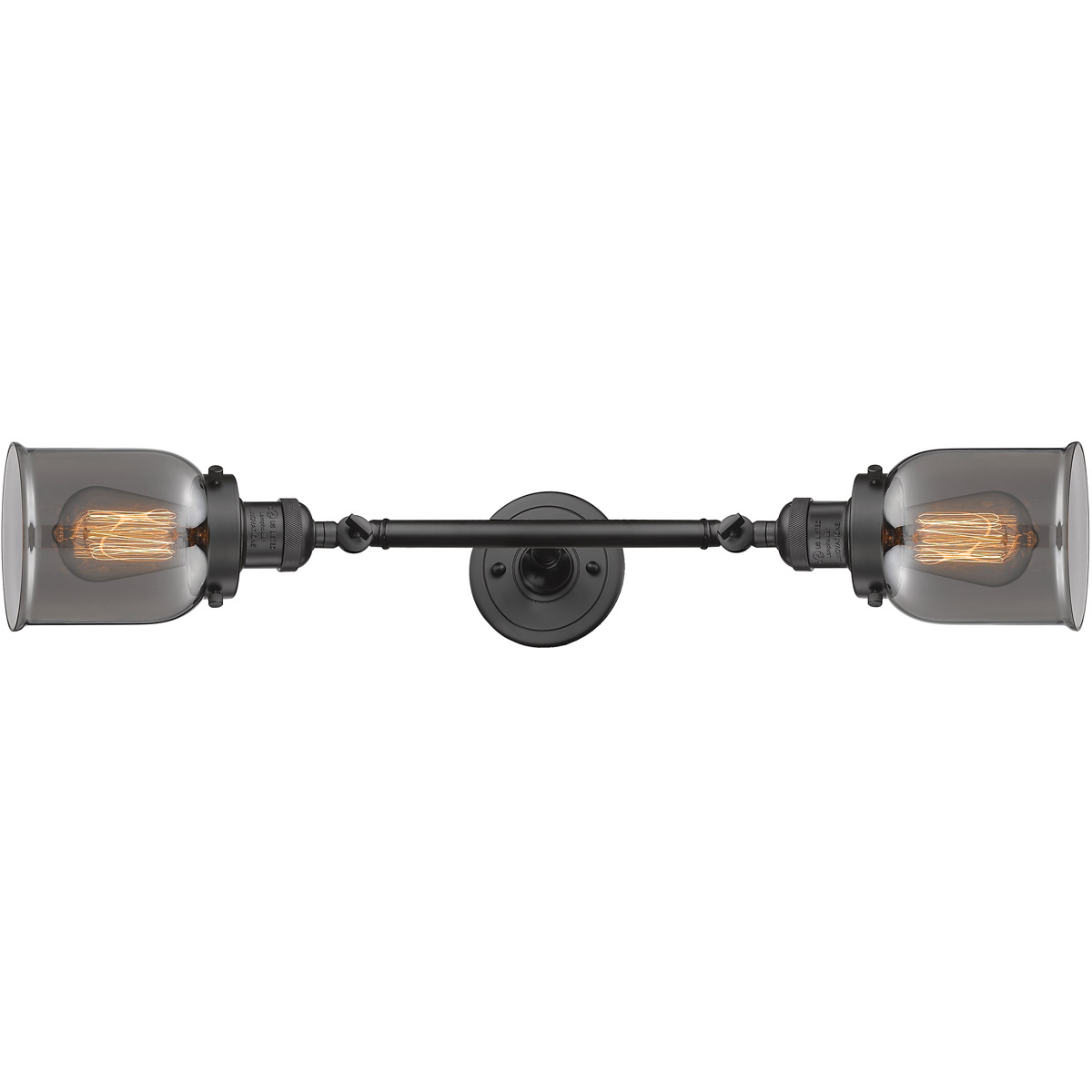 The Innovations Lighting 208L-OB-G53-LED Franklin Restoration Small Bell is a 2-light LED bathroom vanity fixture priced at $437.80 featuring oil-rubbed bronze finish, plated smoke glass bell shades, and integrated 3.5-watt LED bulbs producing 350 lumens at 2700K. Designed by Bruno Marashlian for vintage restoration-style bathrooms, it measures 23 inches high by 5 inches wide with UL/ETL damp-location rating and lifetime electrical warranty.