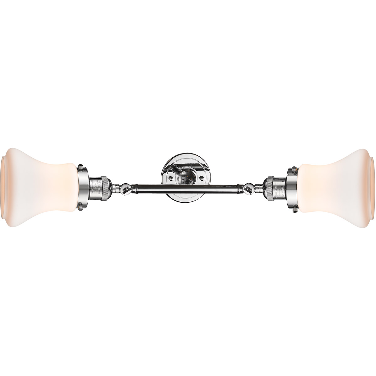 The Innovations Lighting 208L-PC-G191-LED Franklin Restoration Bellmont is a dual-socket LED bathroom vanity light designed by Bruno Marashlian with a polished chrome finish and matte white Bellmont glass shades. Manufactured by Innovations Lighting in New York, this 23.75-inch vertical fixture delivers warm ambient lighting through two included ST64 vintage-style LED bulbs, solving inadequate vanity illumination in bathrooms ranging from 50 to 120 square feet. The steel and cast brass construction carries a two-year finish warranty and lifetime electrical warranty.