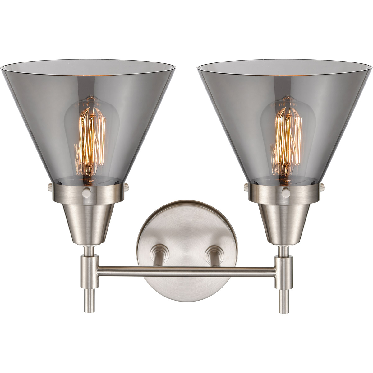 The Innovations Lighting 447-2W-SN-G43 Caden 2 Light 17 inch Satin Nickel Bath Vanity Light Wall Light in Plated Smoke Glass is a wall-mounted bathroom vanity fixture featuring two medium-base sockets housed in plated smoke cone glass shades. Designed by Bruno Marashlian for the Caden collection, it combines industrial-vintage styling with modern engineering tolerances. The fixture mounts directly to bathroom walls and supports up-or-down installation to suit cabinet clearances and lighting preferences.