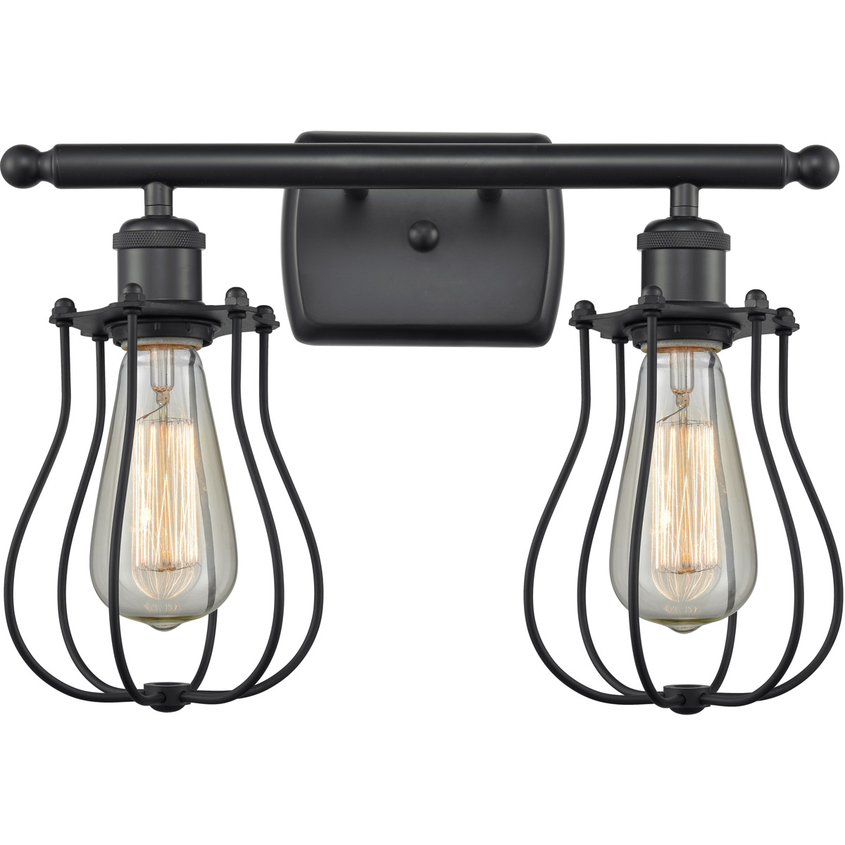 It requires 2 x 60W medium base ST64 vintage incandescent bulbs. These are not included but provide warm, high-CRI light ideal for bathroom use.