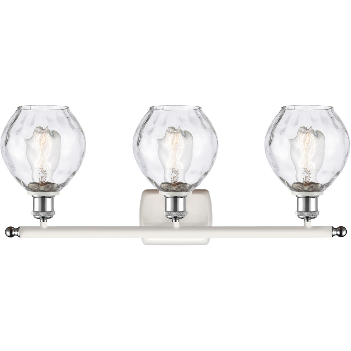 The Innovations Lighting 516-3W-WPC-G362 Ballston Small Waverly 3 Light 26 inch White and Polished Chrome Bath Vanity Light Wall Light, Ballston is a designer bathroom vanity fixture manufactured by Innovations Lighting, a New York-based company founded in 2014. Designed by Bruno Marashlian, this three-socket fixture combines steel, cast brass, and clear Waverly glass in a white and polished chrome finish. It mounts to standard bathroom electrical boxes and accommodates up to 180 watts of incandescent or vintage-style LED lighting.