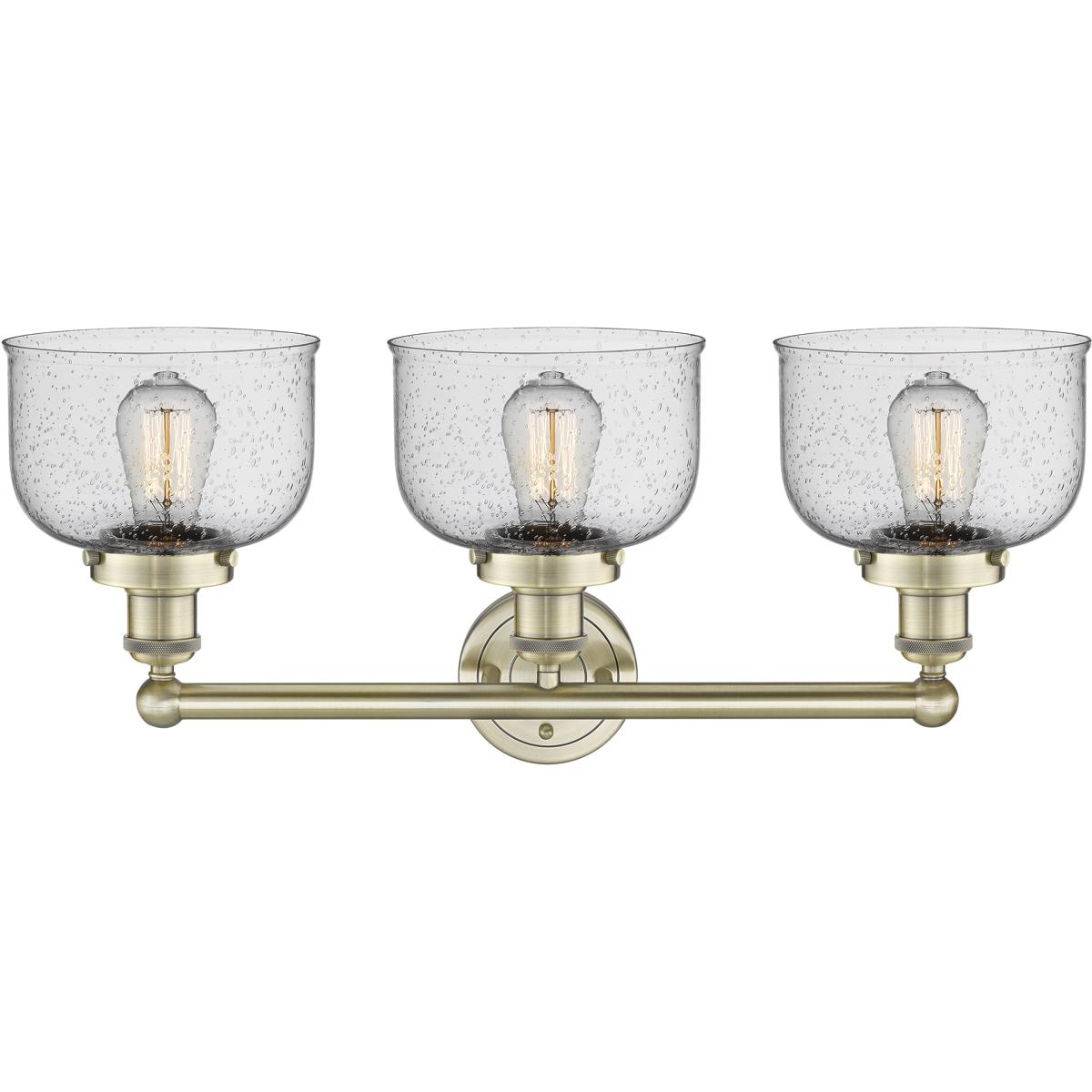 The Innovations Lighting 616-3W-AB-G74 Bell 3 Light 24.5 inch Antique Brass Bath Vanity Light Wall Light in Seedy is a premium 24.5-inch wide vanity fixture with antique brass finish and seedy glass, priced at $404.80. Ideal for modern bathrooms needing elegant, UL-listed damp location lighting with balanced ambient glow.