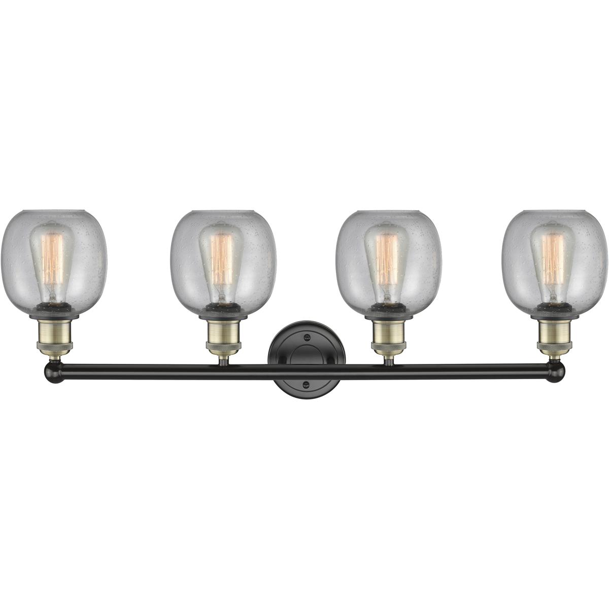 The Innovations Lighting 616-4W-BAB-G104 Belfast 4 Light 33 inch Black Antique Brass Bath Vanity Light Wall Light in Seedy is a premium bathroom fixture with a dual-finish steel and cast brass design, seedy glass, and UL damp rating. Priced at $503.80, it's ideal for modern-vintage bathrooms needing balanced, stylish lighting.