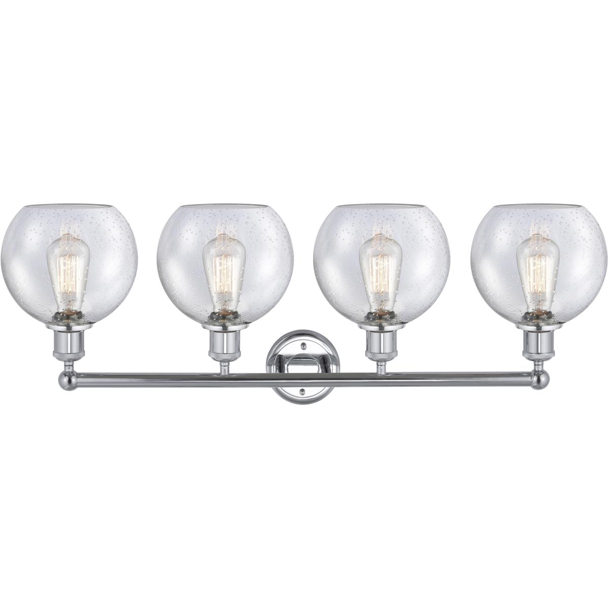 The Innovations Lighting 616-4W-PC-G124-8 Athens is a 35-inch, four-light bathroom vanity fixture priced at $547.80 featuring polished chrome finish, seedy glass shades, and steel/cast brass construction. It accommodates four 100-watt Medium Base ST64 bulbs and suits mid-to-large bathrooms requiring UL-listed damp location lighting with horizontal installation.