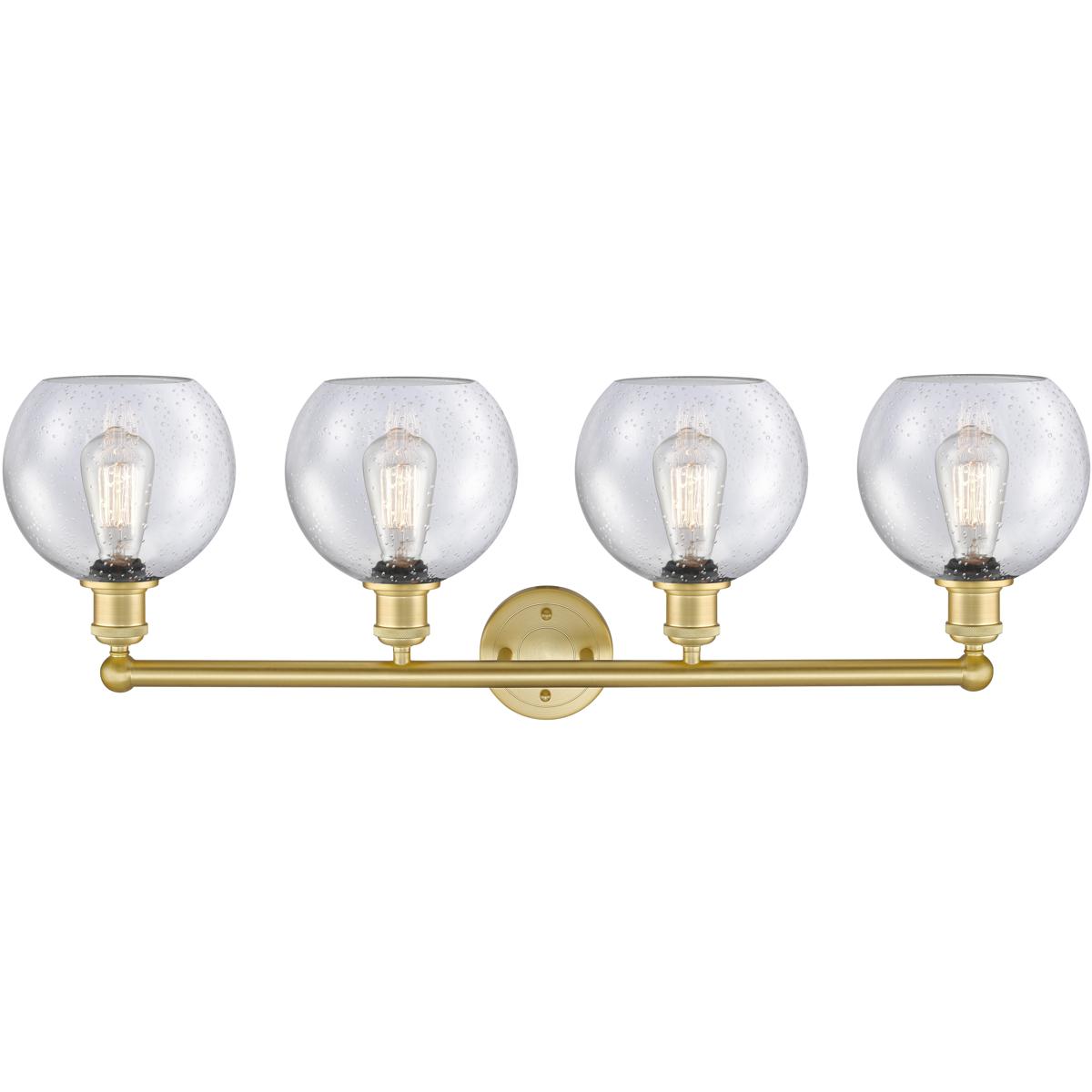 The Innovations Lighting 616-4W-SG-G124-8 Athens 4 Light 35 inch Satin Gold Bath Vanity Light Wall Light in Seedy is a UL-listed bathroom vanity fixture combining steel and cast brass construction with four globe-shaped seedy glass diffusers. Designed by Bruno Marashlian for the Athens collection, it delivers vintage-industrial style for bathroom lighting applications requiring horizontal wall mounting. The fixture ships with a 2-year finish warranty and lifetime electrical warranty, accommodating medium-base Edison bulbs for customizable illumination.