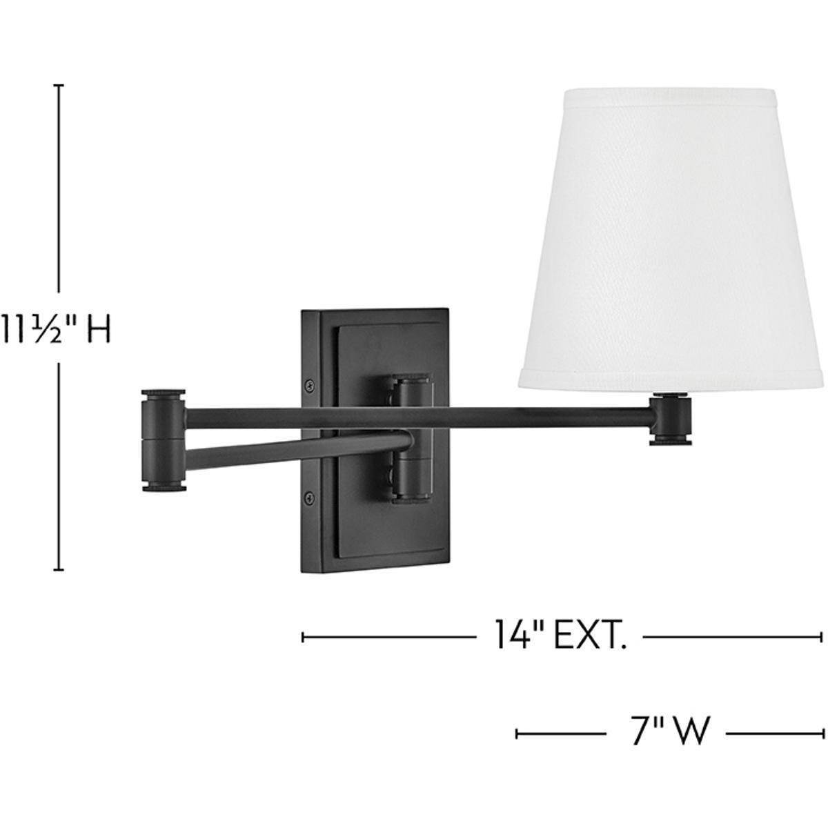The Lark Beale 83772BK is a 7-inch-wide transitional wall sconce with a black steel finish and articulating arm design. It accommodates one 10-watt medium-base bulb (not included) and measures 11.5 inches high by 14 inches deep. The fixture features a white linen shade with acrylic lens and offers both hardwired and plug-in installation methods with a 96-inch lead wire included.