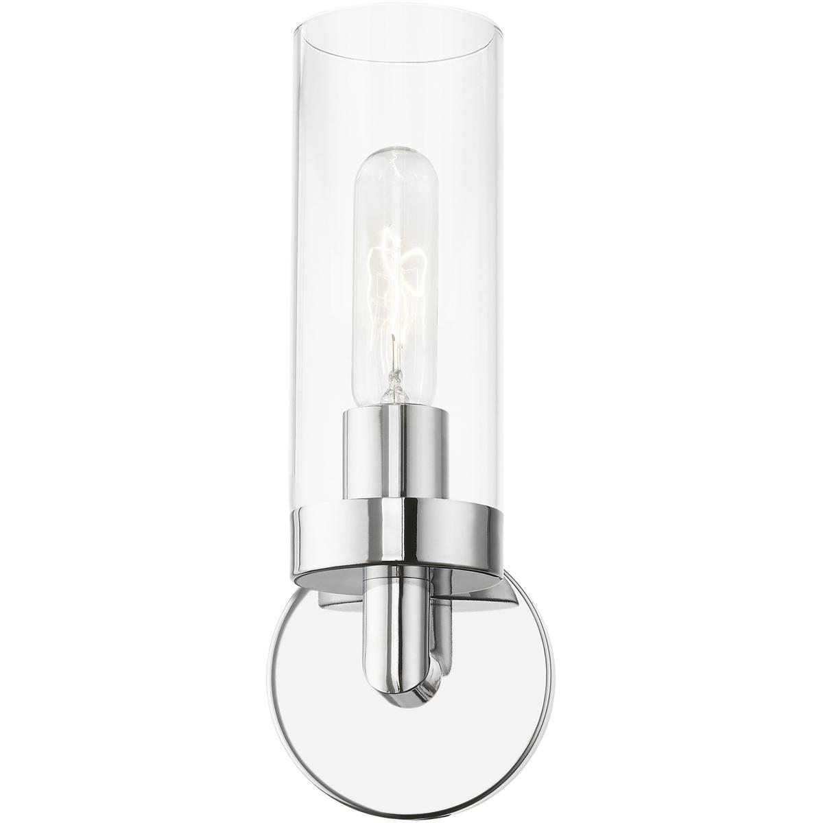 The Livex Lighting 16171-05 Ludlow is an ADA-compliant single-light wall sconce measuring 11.75 inches tall by 4.25 inches wide with a 4-inch extension. It features steel construction with polished chrome finish, a clear cylindrical glass shade, and accepts one 60-watt medium-base bulb. The fixture is damp-rated for bathroom and covered outdoor installation and meets Americans with Disabilities Act projection requirements for accessible hallways and commercial corridors.
