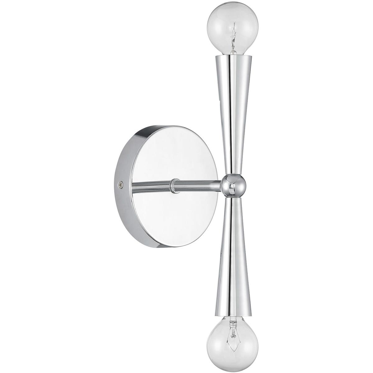 The Meridian Lite Trends M90110CH is a contemporary 2-light chrome wall sconce priced at $108.00 that uses two 60-watt candelabra bulbs to create statement lighting in modern interiors. Measuring 4.75 inches wide by 10 inches high with a sculptural cone-arm design, it suits hallways, bedrooms, and minimalist living spaces requiring damp-rated fixtures with exposed-bulb visual impact.