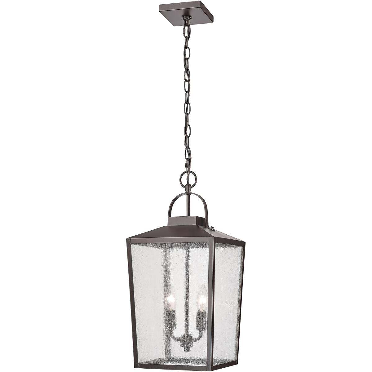 The Millennium Lighting 42655-PBZ is a 2-light outdoor pendant fixture measuring 10 inches wide and 22 inches tall, featuring a powder-coated bronze finish and clear seeded glass panels. It accepts two E12 candelabra bulbs up to 60 watts each (sold separately) and is UL-rated for damp locations such as covered porches and gazebos. The fixture weighs 9.92 pounds and includes 5 feet of adjustable chain with 12 feet of lead wire.