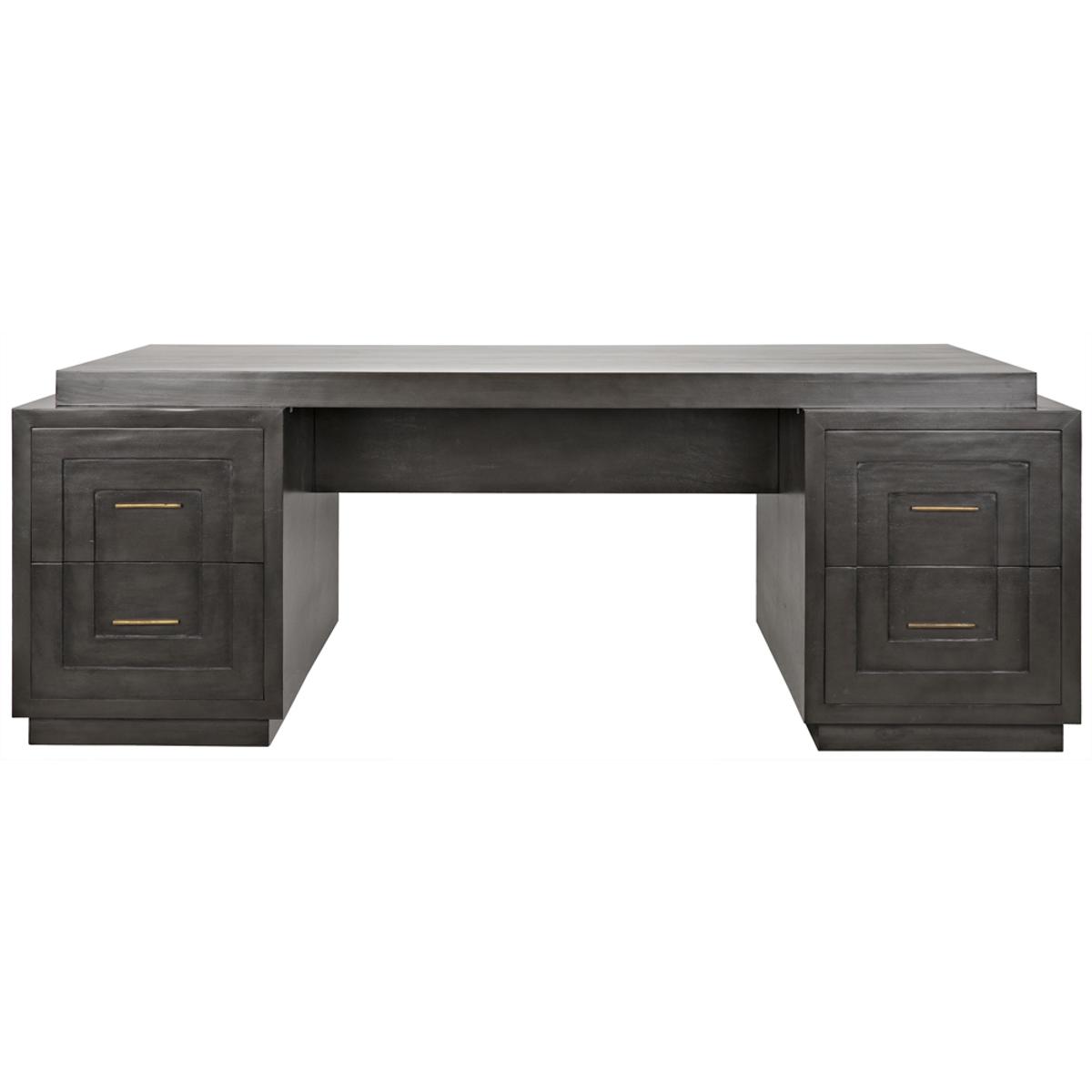 The Noir Furniture Noir GDES159P Mentor 86 X 51 inch Pale Desk is a handcrafted executive desk built from reclaimed mahogany and veneer in Noir's Mentor collection. It anchors large home offices and executive spaces with its 86-inch width, 51-inch depth, and traditional design updated with modern proportions and carved accents. The desk provides eight storage drawers accessed via brass pulls and features a pale finish applied by expert craftsmen.