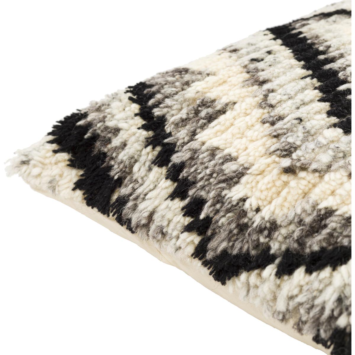 The Surya BES003-1818P Benisouk pillow is hand-knotted from a blend of wool and cotton fibers, crafted in India using traditional artisan techniques. The natural fiber composition provides breathability, texture, and durability. The pillow features a knife-edge finish with a black Moroccan-inspired design and measures 18 x 18 inches in a square format.