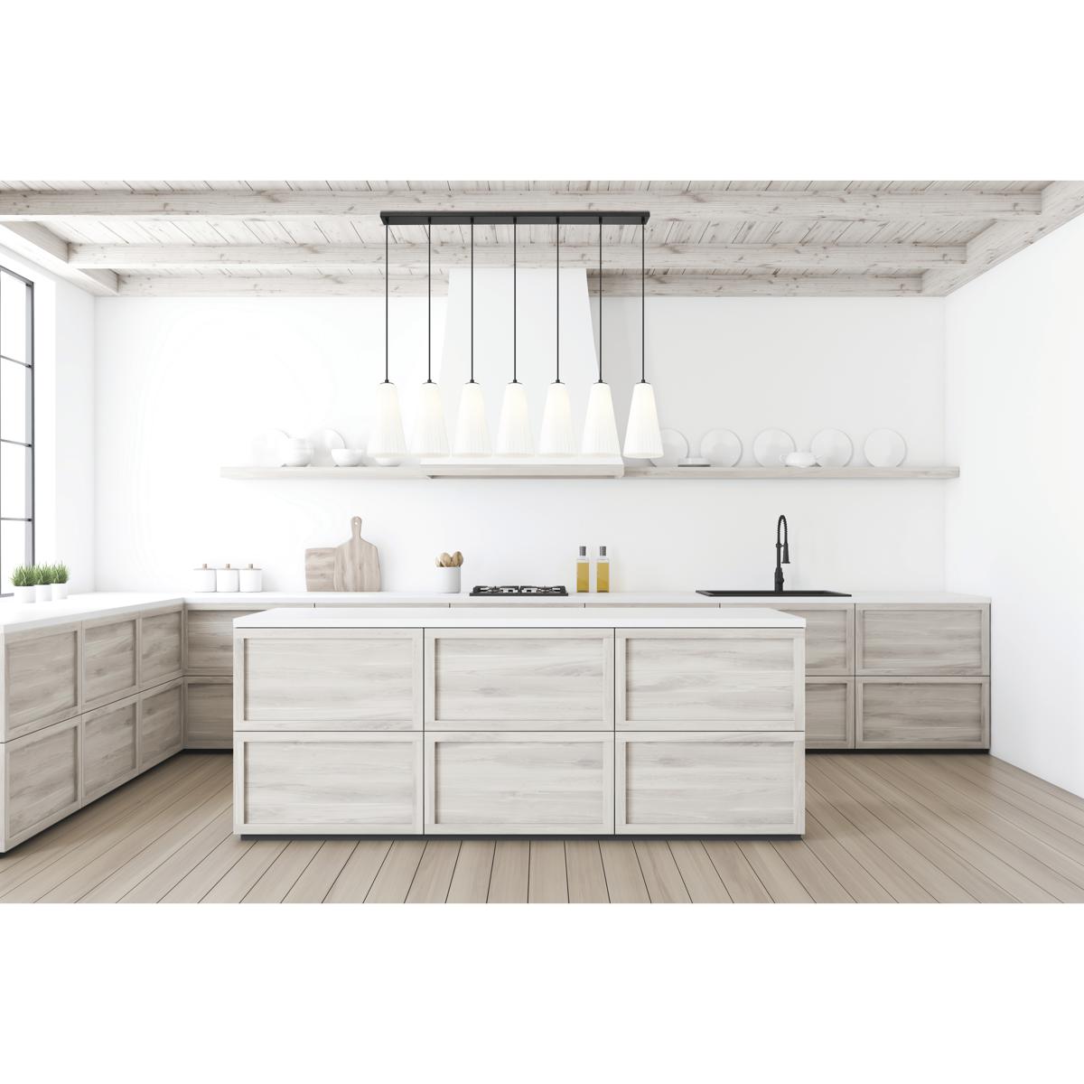Key features include a 54-inch canopy spanning standard kitchen islands, seven elongated glass shades with vertical fluted detailing, and matte black powder-coated steel construction. The fixture accommodates seven 60-watt bulbs (not included) with dimming capability, includes 110 inches of adjustable wire for vaulted ceilings, and carries cETL Damp certification. The 4.75-inch low-profile canopy fits standard junction boxes and weighs 37 pounds total.