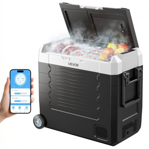 The VEVOR Car Refrigerator is a 58-quart (55L) dual-zone compressor-powered electric cooler designed for reliable refrigeration and freezing in mobile environments. With a temperature range from -4°F to 68°F (-20°C to 20°C), it supports both chilling and freezing, making it suitable for long trips. It operates on DC 12/24V for vehicles or AC 100-240V for home and campground use, offering flexibility across RVs, trucks, boats, and off-grid setups. The unit features app-based temperature control, allowing remote monitoring via smartphone, and includes smooth-rolling wheels and durable handles for easy transport.
