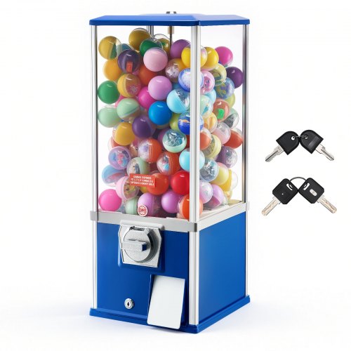 The VEVOR Gumball Machine for Kids is a full-size, coin-operated vending unit designed for home or commercial use. Standing 25 inches tall, this retro-styled machine features a durable PS (polystyrene) construction with a high-capacity dome that holds up to 230 standard capsule toys or bouncy balls. Its classic blue finish and vintage visual design make it a standout accent piece, while the 25-cent coin mechanism ensures simple, reliable operation. Measuring 11.61 x 10.24 x 24.80 inches and weighing 15.43 lbs, it's sturdy yet portable for placement in game rooms, arcades, or retail spaces.